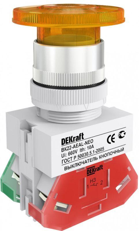 Выключатель кнопочный серии ВК-22 Dekraft; грибовидный толкатель; желтый; с неоновой лампой; ном.ток 10 А; установка — на панели или двери; степень защиты — IP54; подключение — винтовыми зажимами. Выключатели кнопочные ВК-22 предназначены для коммутации электрических цепей и индикации состояния электрических цепей. Применяются в сетях переменного тока частотой 50/60 Гц с напряжением до 660В. Могут устанавливаться на подвижных и неподвижных частях стационарных установок.