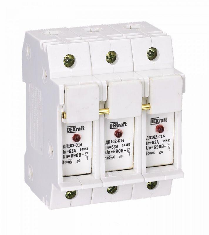 Держатель серии ДП-102 цилиндрического предохранителя ПЦ-102 Dekraft; 3P; для габарита С14 (14 x 51 мм); со светодиодной индикацией срабатывания; номинальный ток – до 64 А; ширина – 3 мод. х 18 мм; установка – на DIN- рейку; рабочее положение — любое, но предпочтительнее вертикальное; подключение питания — сверху или снизу; степень защиты – IP20. Предохранители применяются для защиты сетей от перегрузки и токов КЗ в сетях напряжением до 500 В.