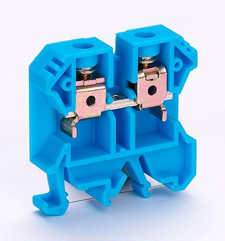 Зажим наборный серии ЗН-101 Dekraft ; номинальный ток — 100 А; сечение проводов от 1 до 16 кв.мм; цвет and ndash; синий; материал корпуса — полиамид; материал клемм и винтов and ndash; латунь; монтаж — защелкиванием на DIN-рейку; количество в упаковке and ndash; 50 шт. Клемма выполнена таким образом, что обеспечивает двойной обжим проводника. Это обеспечивается в том числе и за счет насечек на клеммах. Зажимы наборные синего цвета применяются для присоединения нулевого рабочего проводника.