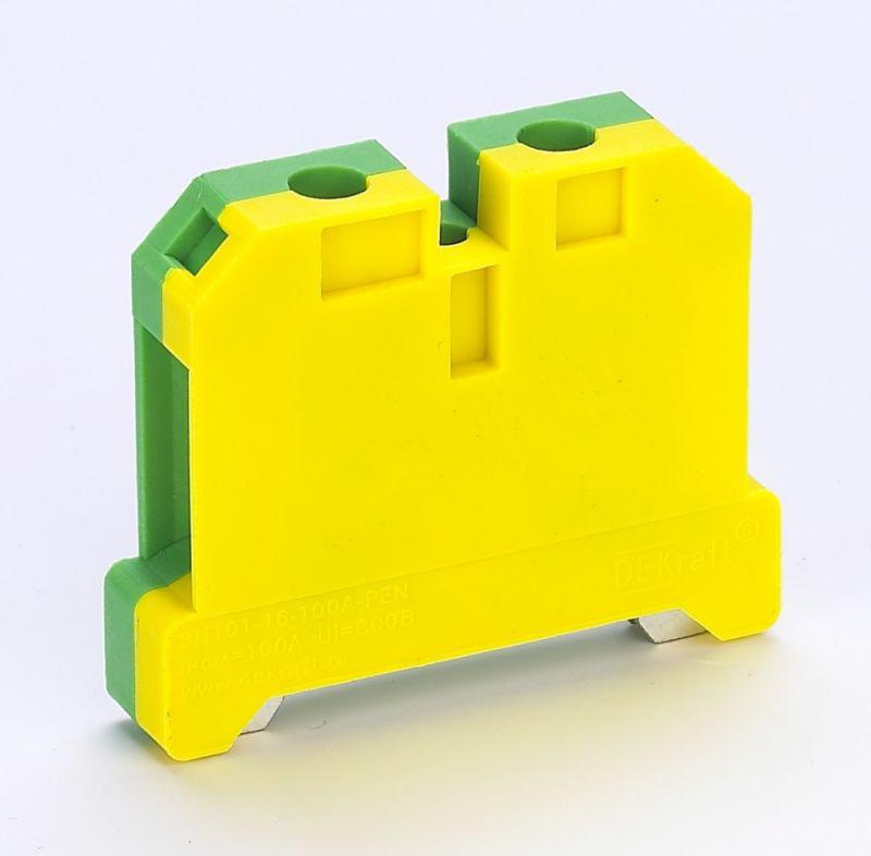 Зажим наборный серии ЗН-101 Dekraft ; номинальный ток — 100 А; сечение проводов от 1 до 16 кв.мм; цвет and ndash; желто-зеленый; материал корпуса — полиамид; материал клемм и винтов and ndash; латунь; монтаж — защелкиванием на DIN-рейку; количество в упаковке and ndash; 40 шт. Клемма выполнена таким образом, что обеспечивает двойной обжим проводника. Это обеспечивается в том числе и за счет насечек на клеммах. Зажимы наборные желто-зеленого цвета применяются для подключения нулевого защитного проводника PE.