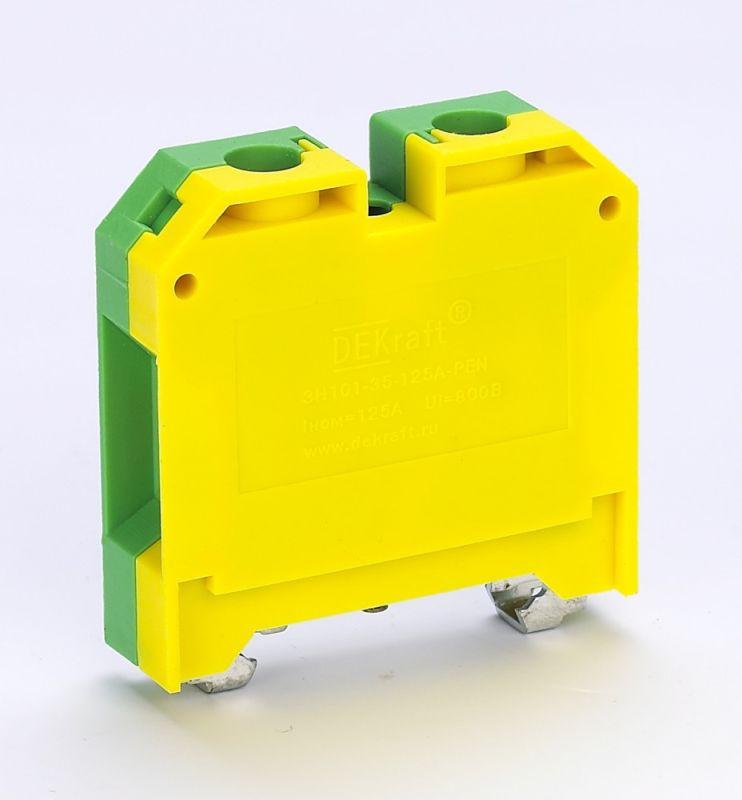 Зажим наборный серии ЗН-101 Dekraft ; номинальный ток — 125 А; сечение проводов от 3 до 35 кв.мм; цвет – желто-зеленый; материал корпуса — полиамид; материал клемм и винтов – латунь; монтаж — защелкиванием на DIN-рейку; количество в упаковке – 20 шт. Клемма выполнена таким образом, что обеспечивает двойной обжим проводника. Это обеспечивается в том числе и за счет насечек на клеммах. Зажимы наборные желто-зеленого цвета применяются для подключения нулевого защитного проводника PE.