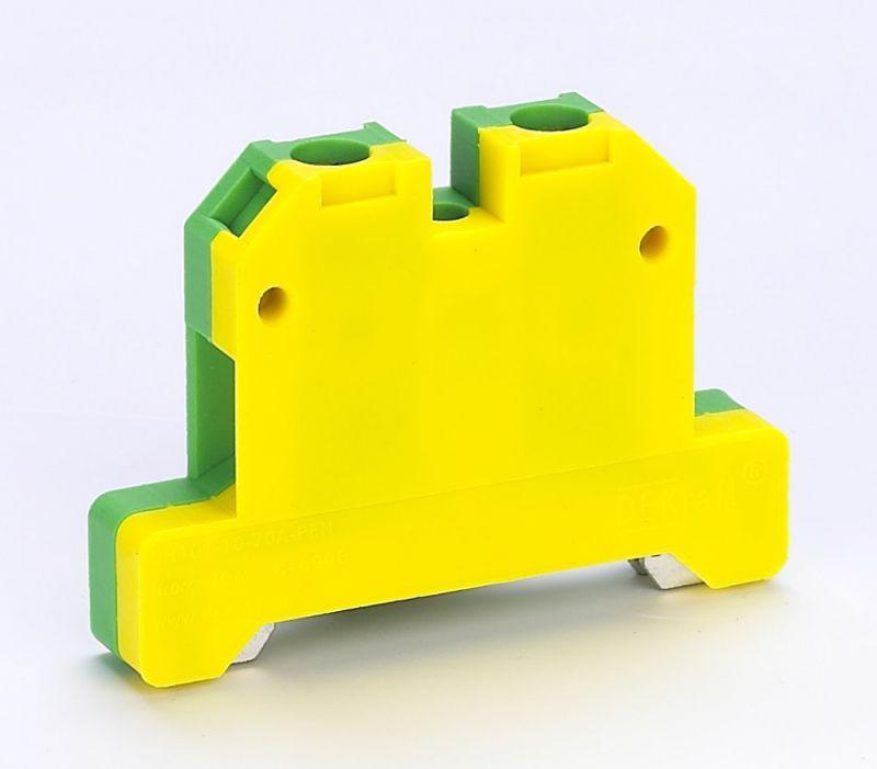 Зажим наборный серии ЗН-101 Dekraft ; номинальный ток — 70 А; сечение проводов от 1 до 10 кв.мм; цвет and ndash; желто-зеленый; материал корпуса — полиамид; материал клемм и винтов and ndash; латунь; монтаж — защелкиванием на DIN-рейку; количество в упаковке and ndash; 40 шт. Клемма выполнена таким образом, что обеспечивает двойной обжим проводника. Это обеспечивается в том числе и за счет насечек на клеммах. Зажимы наборные желто-зеленого цвета применяются для подключения нулевого защитного проводника PE.