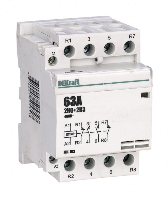 Модульный контактор серии МК-103 Dekraft; ном.ток 40 А (АС-7а); кол-во и исполнение контактов – 2НО+2НЗ; напряжение управления 220 В пер.тока; ширина – 3 мод. х 18 мм; установка – на DIN-рейку. Контакторы МК-103 применяются в сетях напряжением до 400 В пер.тока для дистанционного управления небольшими нагрузками, требующими большого количества включений / отключений, например, насосы, системы вентиляции и т.п. Модульные контакторы не требуют дополнительных настроек и специального обслуживания.