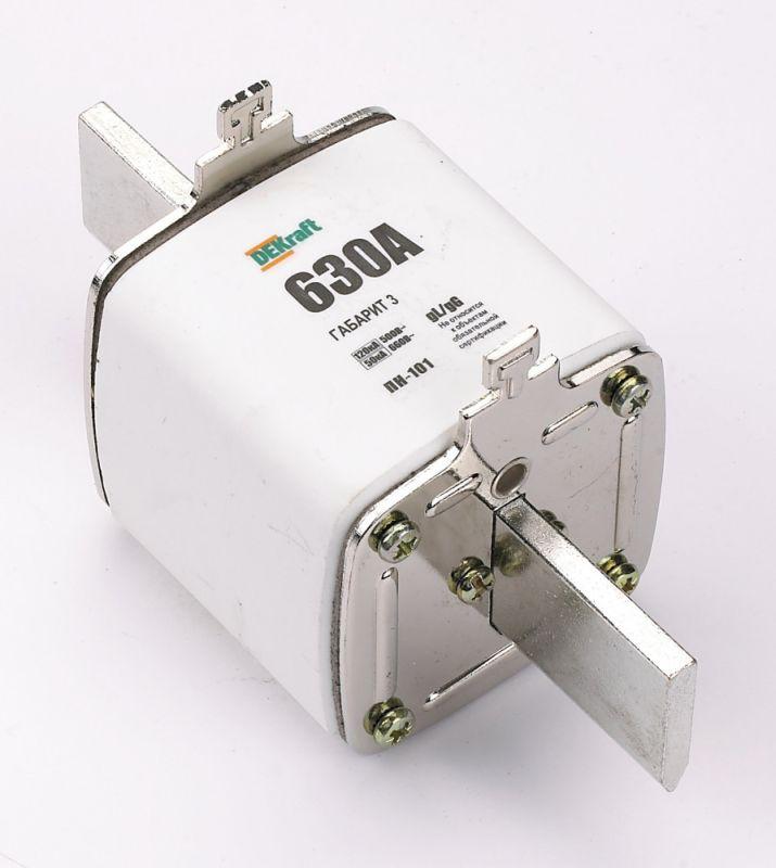 Предохранитель ножевой серии ПН-101 Dekraft; тип 39; габарит 3; ном. ток 630 А. Предохранители ножевые применяются в однофазных и трехфазных сетях переменного тока, напряжением до 660 В, частотой 50 Гц. Они представляют собой наиболее компактные и экономичные устройства защиты электрических цепей и кабельных линий от перегрузки и короткого замыкания. Индикатор состояния позволяет быть уверенным в защите электрооборудования.