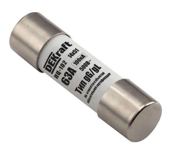Предохранитель цилиндрический серии ПЦ-102 Dekraft; категория – gG; габарит — C14 (14 x 51 мм); номинальный ток 53 А; установка – в держателях на DIN- рейку; рабочее положение — любое, но предпочтительнее вертикальное. Цилиндрические предохранители применяются для защиты сигнальных, управляющих электрический цепей (класс gG) от перегрузки и токов КЗ в сетях напряжением до 500 В. Предохранители устанавливаются в шкафах управления и распределительных щитах низкого напряжения.