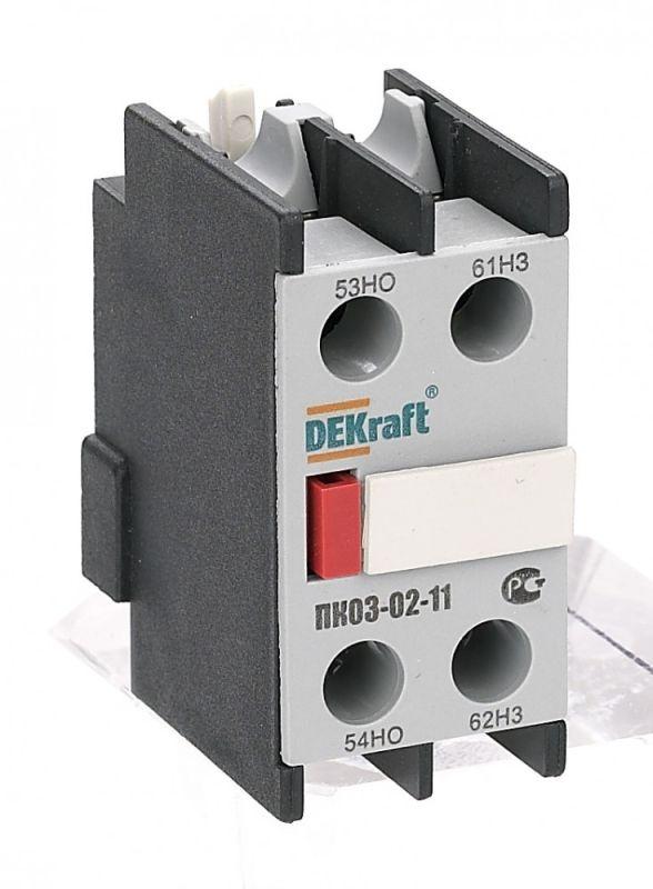 Приставка контактная серии ПК-03-02 для контакторов КМ-103 Dekraft; кол-во контактов — 1НО+1НЗ; ном.ток 10 А; ном.напряжение до 690 В; установка с лицевой стороны; степень защиты IP20. Приставки контактные предназначены для увеличения количества вспомогательных контактов контактора. Контактные приставки механически соединяются с контакторами и фиксируются при помощи защелки. Приставка подходит для использования с контакторами других производителей.