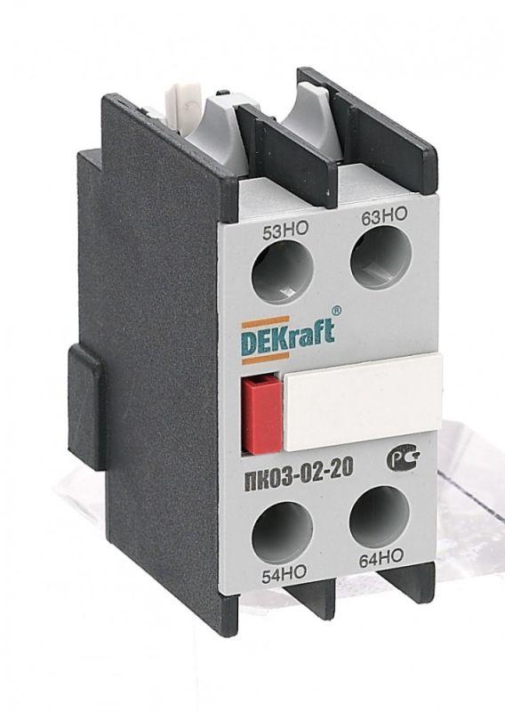 Приставка контактная серии ПК-03-02 для контакторов КМ-103 Dekraft; кол-во контактов — 2НО; ном.ток 10 А; ном.напряжение до 690 В; установка с лицевой стороны; степень защиты IP20. Приставки контактные предназначены для увеличения количества вспомогательных контактов контактора. Контактные приставки механически соединяются с контакторами и фиксируются при помощи защелки. Приставка подходит для использования с контакторами других производителей.