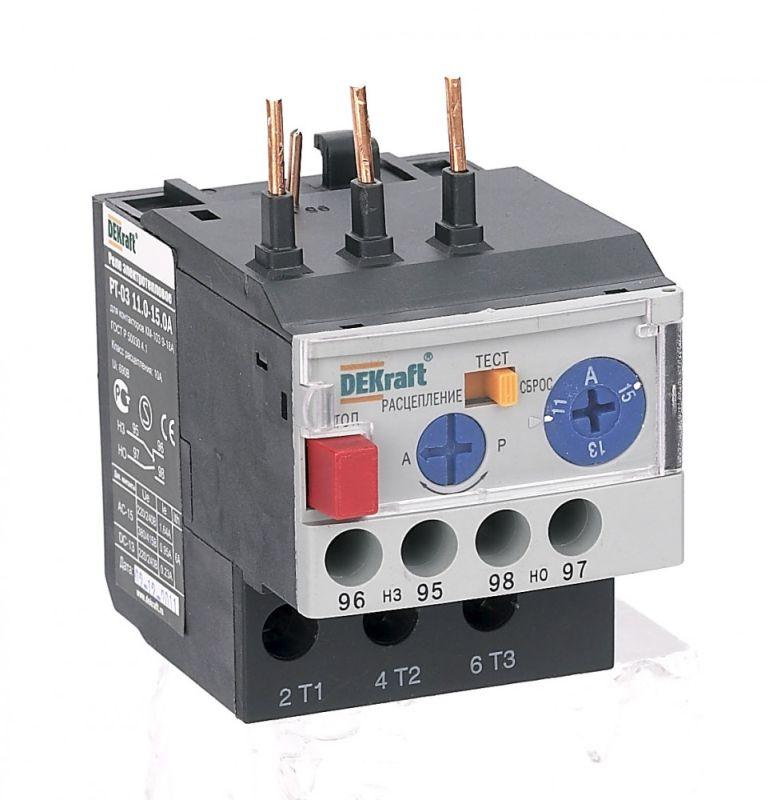 Тепловое реле перегрузки серии РТ-03 Dekraft; предназначено для применения с контакторами КМ-103 на ток 9-18 А; трехполюсное; диапазон уставок реле 11-15 А; класс расцепления 10А; два режима повторного включения — ручной и автоматический. Тепловые реле РТ-03 применяются для защиты цепей переменного тока и электродвигателей от перегрузки, асимметрии фаз, затянутого пуска и заклинивания ротора. Реле подходит к соответствующим контакторам других производителей.