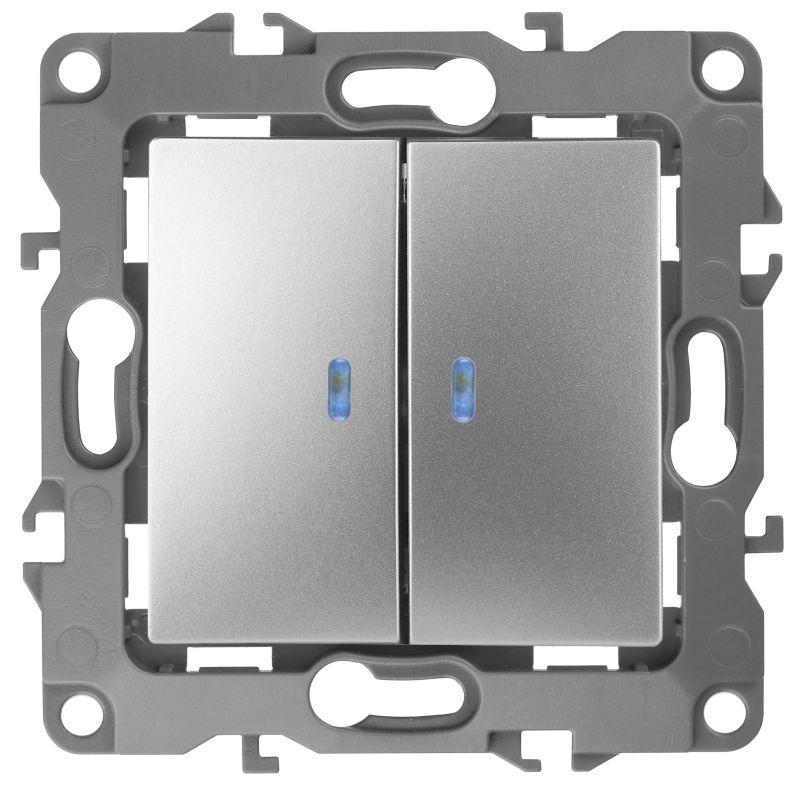 Выключатель 2-клавишный с подсветкой серии Эра 12 скрыт.установки механизм цвет алюминий 12-1105-03. Номинальные характеристики 10А 250В . Сделан из поликарбоната, оснащёно автоматическими клеммами для быстрй и надёжной фиксации жил кабеля в механиме. Парные клеммы обеспечивают соединение шлейфом. Монтаж в подрозетник производится и на лапки, и на винты. Рамки приобретаются отдельно. Рамки Эра 12: 1 пост 12-5001-хх, 2 поста 12-5002-хх, 3 поста 12-5003-хх, 4 поста 12-5004-хх, 5 постов 12-5005-хх. Рамки Эра 12 Сатин: 1 пост 12-5101-хх, 2 поста 12-5102-хх, 3 поста 12-5103-хх, 4 поста 12-5104-хх, 5 постов — 12-5105-хх (хх — код цвета: 01-белый, 02-слоновая кость, 03-алюминий, 04-шампань, 05-антрацит, 06-чёрный, 07-ольха(белёный дуб-сатин), 08-вишня, 09-дуб, 10-венге, 11-сосна, 21-жёлтый, 22-оранжевый, 23-красный, 24-охра, 25-бордо, 26-лайм, 27-зелёный, 28-голубой, 29-синий).