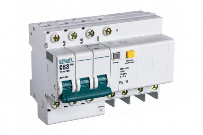 Автоматический выключатель дифференциального тока серии ДИФ-101 Dekraft; 3P+N; ном.ток 63 А; характеристика C; откл.способность Icn = 4,5 kA; ток утечки 100 мА; блок дифф.защиты – электронный; ширина – 7 мод. х 18 мм; монтаж – на DIN-рейку. АВДТ применяются в сетях напряжением до 400 В пер.тока для защиты электроустановок от сверхтоков и токов утечки. Для расширения функционала АВДТ возможно использование аксессуаров от выключателей серии ВА-101.