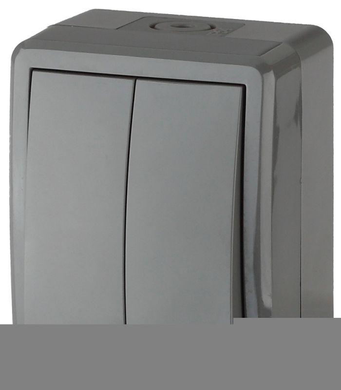 Выключатель влагозащищённый IP54 2-клавишный серии Эра Эксперт открытой уст. цвет серый 11-1404-03. Номинальные характеристики. Выключатель выполнен из качественного поликарбоната, оснащён уникальными винтовыми клеммами ЭКСПЕРТ для максимально качественного зажима кабеля в механизме.
