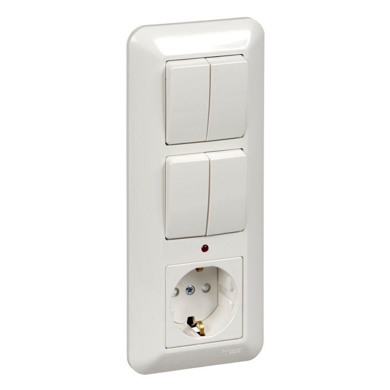 Блок комбинированный Systeme Electric (ранее Schneider Electric) BLANCA (скрытой установки, белый) предназначен для сетей до 250 В, состоит из розетки на 16 А со шторками и с заземлением и двух двухклавишных выключателей, оба на 6 А.