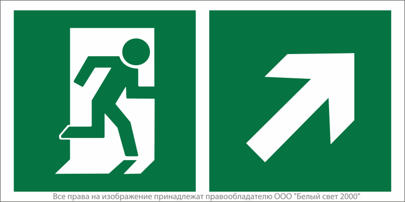 Знак безопасности «Направление к эвакуационному выходу направо вверх» габаритные размеры 350х175 мм, фактические размеры 350х175 мм, сигнальный цвет — зеленый, контрастный цвет — белый