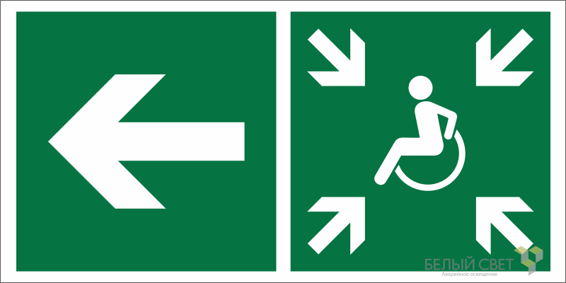 Знак безопасности «Направление движения к пункту сбора (безопасной зоне) МГН налево» габаритные размеры 270х135 мм, фактические размеры 270х135 мм, сигнальный цвет — зеленый, контрастный цвет — белый