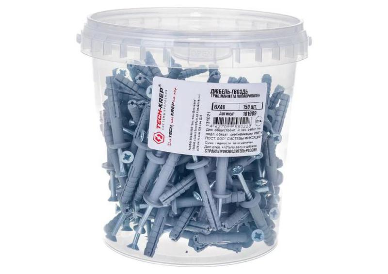 Дюбель-гвоздь SM-G состоит из следующих элементов: дюбель с грибовидным бортиком и двухсегментной распорной зоной, распорный элемент – специальный гвоздь с потайной головкой с крестообразным шлицем PZ и усиленным подголовником. Дюбель изготовлен из полипропилена, гвоздь – из углеродистой стали, покрытие – желтый цинк. Дюбель-гвоздь предназначен для крепления строительных материалов и изделий к основаниям из бетона, полнотелого кирпича, строительного камня. Применяется для сквозного монтажа кронштейнов, дверных коробок, оконных рам, кабельных каналов, обрешетки, гипсокартонных листов (ГКЛ), гипсоволокнистых листов (ГКЛ) и т.д. Для установки необходимо предварительно просверлить отверстие. Прочность крепежа достигается расклиниванием дюбеля в отверстии гвоздем в момент удара молотком. С помощью крестообразного шлица на головке гвоздя можно легко ослабить или усилить крепеж, демонтировать его.