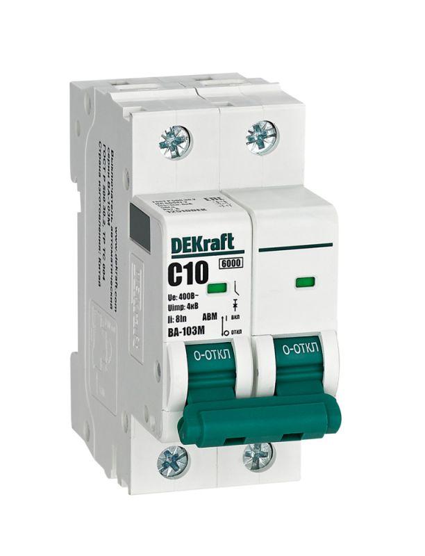 Автоматический выключатель без теплозащиты серии ВА-103M Dekraft; 2P; ном. ток 10 А; ном. раб. напряжение 400 В; кривая отключения C. Автоматические выключатели серии ВА-103М имеют специальное назначение для систем противопожарной защиты и вентиляции и выдерживают ток КЗ до 6000 А. Также они могут использоваться для нечастых оперативных включений и отключений указанных цепей. Автоматические выключатели соответствуют директиве RoHS, имеют расширенный диапазон рабочих температур от -25 до +60 °C, удобны и безопасны в эксплуатации.