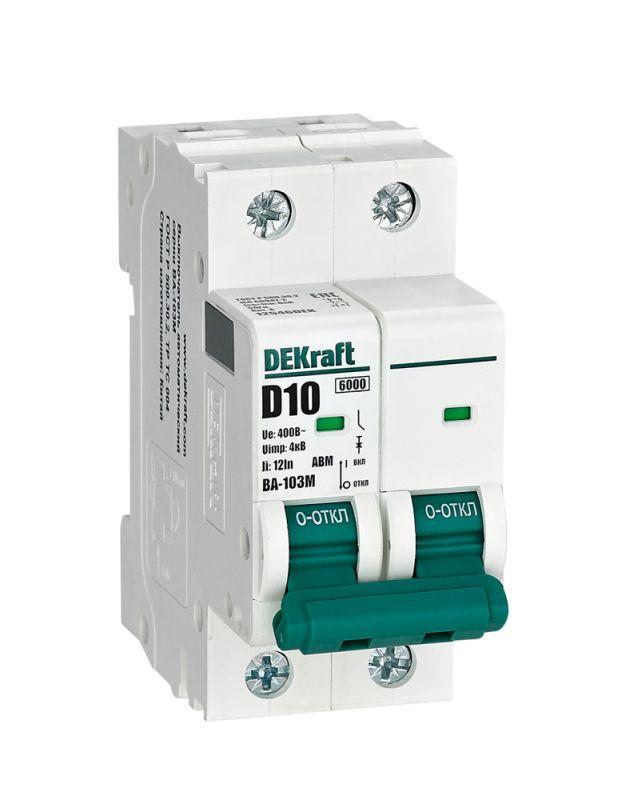 Автоматический выключатель без теплозащиты серии ВА-103M Dekraft; 2P; ном. ток 10 А; ном. раб. напряжение 400 В; кривая отключения D. Автоматические выключатели серии ВА-103М имеют специальное назначение для систем противопожарной защиты и вентиляции и выдерживают ток КЗ до 6000 А. Также они могут использоваться для нечастых оперативных включений и отключений указанных цепей. Автоматические выключатели соответствуют директиве RoHS, имеют расширенный диапазон рабочих температур от -25 до +60 °C, удобны и безопасны в эксплуатации.