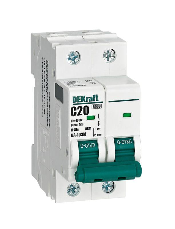 Автоматический выключатель без теплозащиты серии ВА-103M Dekraft; 2P; ном. ток 20 А; ном. раб. напряжение 400 В; кривая отключения C. Автоматические выключатели серии ВА-103М имеют специальное назначение для систем противопожарной защиты и вентиляции и выдерживают ток КЗ до 6000 А. Также они могут использоваться для нечастых оперативных включений и отключений указанных цепей. Автоматические выключатели соответствуют директиве RoHS, имеют расширенный диапазон рабочих температур от -25 до +60 °C, удобны и безопасны в эксплуатации.