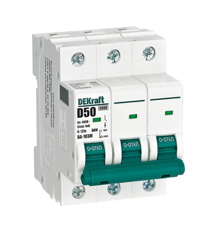 Автоматический выключатель без теплозащиты серии ВА-103M Dekraft; 3P; ном. ток 50 А; ном. раб. напряжение 400 В; кривая отключения D. Автоматические выключатели серии ВА-103М имеют специальное назначение для систем противопожарной защиты и вентиляции и выдерживают ток КЗ до 6000 А. Также они могут использоваться для нечастых оперативных включений и отключений указанных цепей. Автоматические выключатели соответствуют директиве RoHS, имеют расширенный диапазон рабочих температур от -25 до +60 °C, удобны и безопасны в эксплуатации.