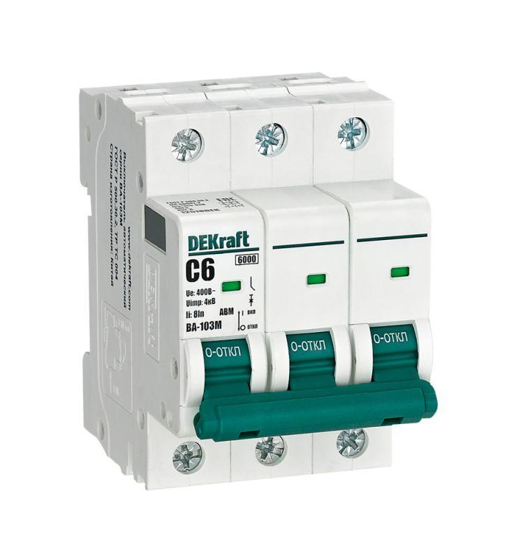 Автоматический выключатель без теплозащиты серии ВА-103M Dekraft; 3P; ном. ток 6 А; ном. раб. напряжение 400 В; кривая отключения C. Автоматические выключатели серии ВА-103М имеют специальное назначение для систем противопожарной защиты и вентиляции и выдерживают ток КЗ до 6000 А. Также они могут использоваться для нечастых оперативных включений и отключений указанных цепей. Автоматические выключатели соответствуют директиве RoHS, имеют расширенный диапазон рабочих температур от -25 до +60 °C, удобны и безопасны в эксплуатации.