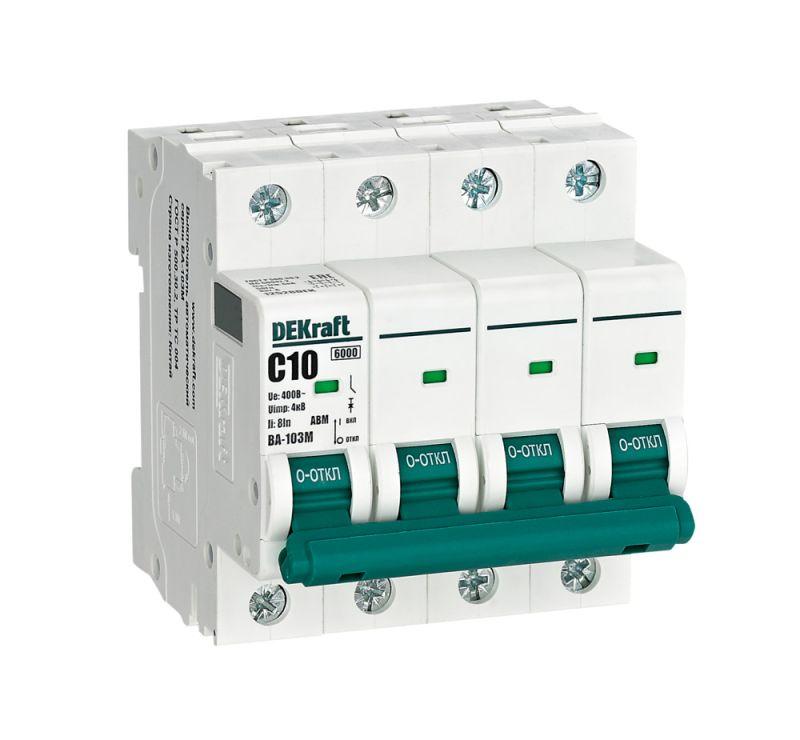Автоматический выключатель без теплозащиты серии ВА-103M Dekraft; 4P; ном. ток 10 А; ном. раб. напряжение 400 В; кривая отключения C. Автоматические выключатели серии ВА-103М имеют специальное назначение для систем противопожарной защиты и вентиляции и выдерживают ток КЗ до 6000 А. Также они могут использоваться для нечастых оперативных включений и отключений указанных цепей. Автоматические выключатели соответствуют директиве RoHS, имеют расширенный диапазон рабочих температур от -25 до +60 °C, удобны и безопасны в эксплуатации.