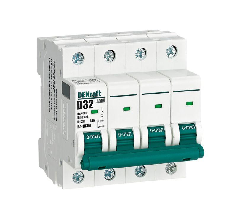 Автоматический выключатель без теплозащиты серии ВА-103M Dekraft; 4P; ном. ток 32 А; ном. раб. напряжение 400 В; кривая отключения D. Автоматические выключатели серии ВА-103М имеют специальное назначение для систем противопожарной защиты и вентиляции и выдерживают ток КЗ до 6000 А. Также они могут использоваться для нечастых оперативных включений и отключений указанных цепей. Автоматические выключатели соответствуют директиве RoHS, имеют расширенный диапазон рабочих температур от -25 до +60 °C, удобны и безопасны в эксплуатации.