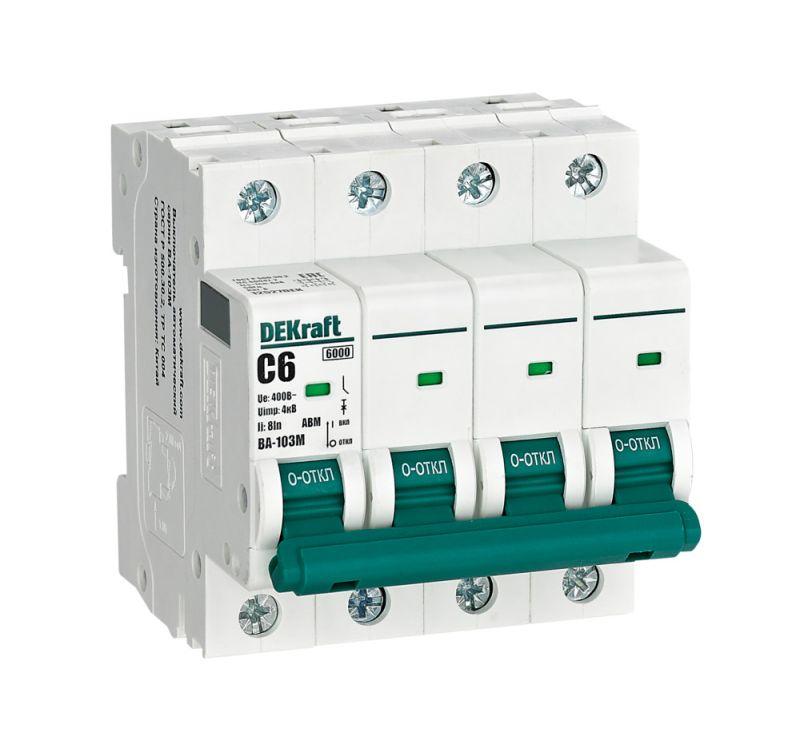 Автоматический выключатель без теплозащиты серии ВА-103M Dekraft; 4P; ном. ток 6 А; ном. раб. напряжение 400 В; кривая отключения C. Автоматические выключатели серии ВА-103М имеют специальное назначение для систем противопожарной защиты и вентиляции и выдерживают ток КЗ до 6000 А. Также они могут использоваться для нечастых оперативных включений и отключений указанных цепей. Автоматические выключатели соответствуют директиве RoHS, имеют расширенный диапазон рабочих температур от -25 до +60 °C, удобны и безопасны в эксплуатации.