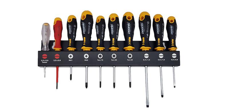 Набор состоит из восьми отверток Ergonic, диэлектрической отвертки и отвертки-тестера напряжения. Применяются они для работы с резьбовыми соединенияи и различного рода крепежом. Наличие в комплекте диэлектрической отвёртки позволяет работать под напряжением. Инструменты обладают высокой прочностью, рукоятки эргономичной формы приспосабливается под руку любого пользователя.