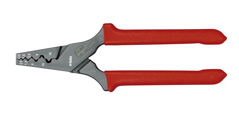 Felo Клещи для снятия изоляции 0,5 – 16 мм используется для резки провода , опрессовки наконечников 0,5-16 кв.мм, снятия оболочки с плоских проводов. Клещи оснащены удобными для удержания изделия двухкомпонентными рукоятками.