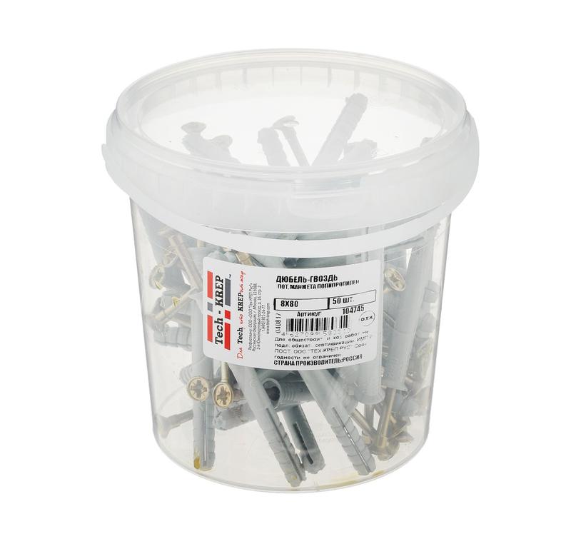 Дюбель-гвоздь 8х80 с потайной манжетой полипропилен (уп.50шт) ведро Tech-Krep 104745