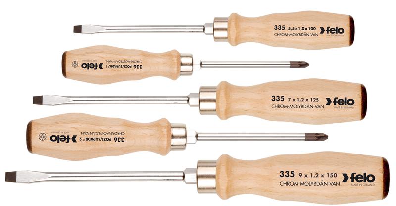 Felo Набор отверторк ударных SL/PZ с деревянной рукояткой Состав набора: серия 335 SL 5,5×100 / 7,0×125 / 9,0×150, серия 336 PZ 1×80 / PZ 2×100. Литой цельный стержень позволяет использовать в работе молоток.