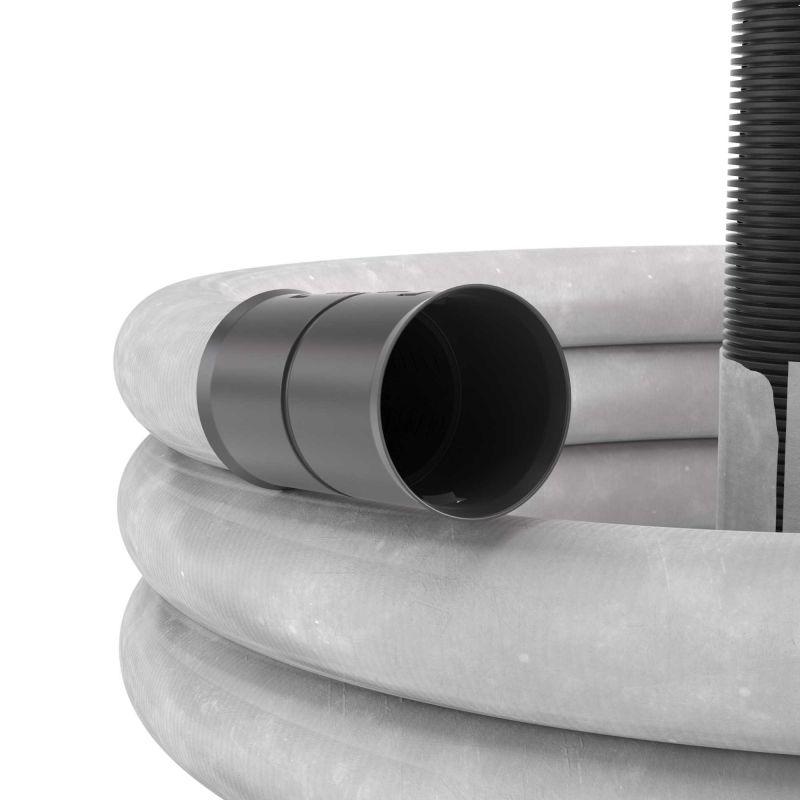 Дренажная труба из ПНД с геофильтром обладает высокой прочностью (класс SN6). Труба имеет диаметр 200 мм, по всему диаметру выполнена перфорация. Поставляется в бухте 35 метров. Цвет — черный.