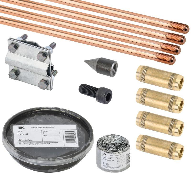 Комплект заземления товарного знака IEK используется для организации заземляющего устройства жилых объектов, объектов энергетического и промышленного комплексов, объектов связи. Данный комплект монтируется на глубину 6 метров путём последовательного соединения и заглубления стержней с помощью перфоратора или кувалды.