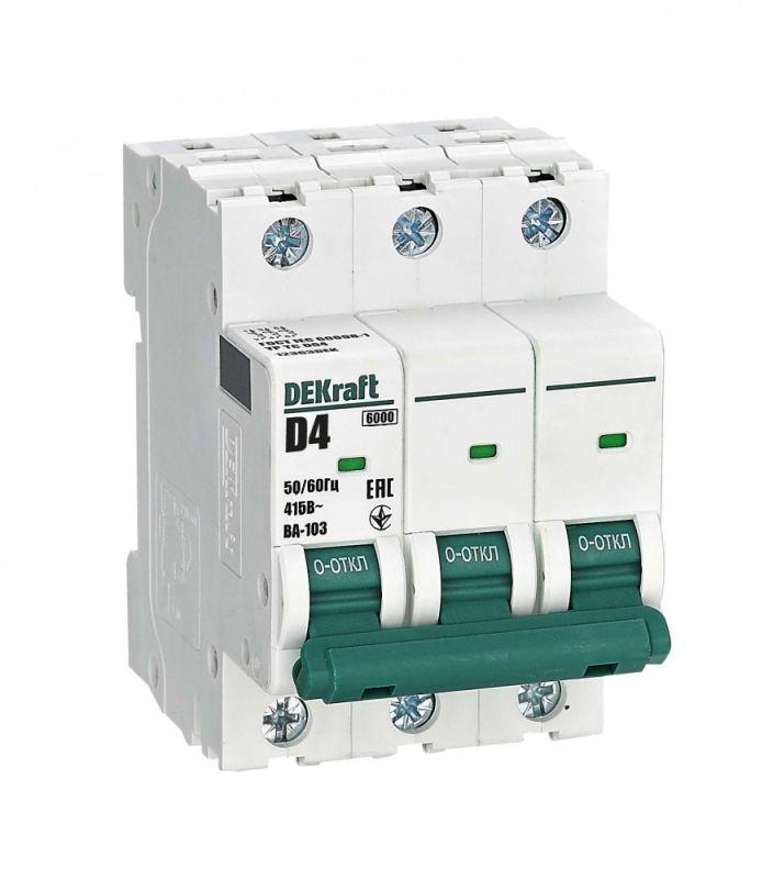 Автоматический выключатель серии ВА-103 NEW Dekraft; 3P; номинальный ток 4 А; характеристика D; отключающая способность 6 кА, что позволяет использовать аппараты в качестве вводных. 5 монолитных заклепок повышают прочность корпуса аппарата. Окошко-индикатор всегда показывает состояние контактов вне зависимости от положения рукоятки управления. Боковые каналы охлаждения повышают стабильность работы при высоких температурах окружающей среды. Есть возможность установки дополнительных аксессуаров с левой стороны устройства. Аппарат на 100% совместим с корпусами и оболочками Dekraft, Systeme Electric.
