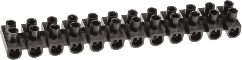 Клемная колодка состоит из 12 парных зажимов и легко режется на блоки с меньшим числом клеммных пар. Подключение электрических проводников осуществляется при помощи прижатия проводов винтами из оцинкованной стали. Материал корпуса колодки – белый или черный пластичный полиэтилен. Материал металлической планки – латунь.