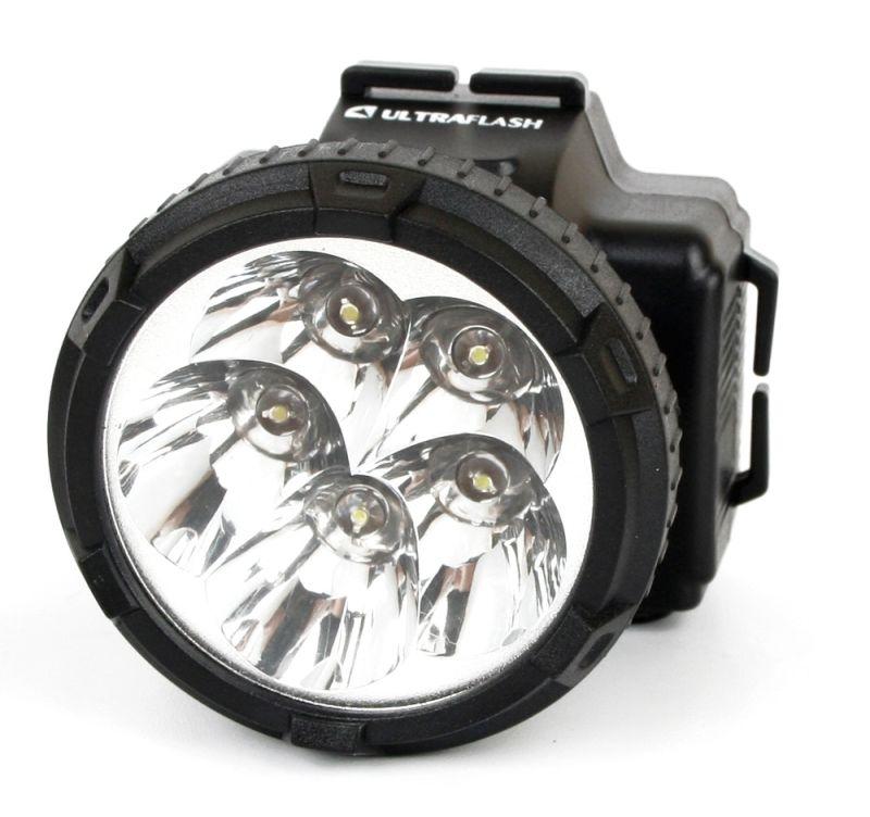 Фонарь Ultraflash электрический светодиодный налобный аккумуляторный. Цвет корпуса: матовый черный. Материал корпуса — пластик. Источники света — 5 светодиодов с индивидуальными отражателями и суммарным световым потоком — до 20 люмен. Дистанция освещения — до 20 метров. 2 режима работы — 5 светодиодов в режиме полной мощности / 5 светодиодов в режиме половины мощности. Выключатель: двухпозиционный кнопочный. Время работы до 5 часов. Время заряда 7 часов. Комплектация: фонарь, герметичный свинцово-кислотный аккумулятор DC 4 вольт 0,42 А-ч, сетевой кабель для заряда от сети ~220 В, поворотный отражатель, эластичный головной ремешок, инструкция, упаковка. Степень пыле-влаго-защиты IP22. Упаковка — коробка. Максимальный линейный размер фонаря 6 см. Размер упаковки 9 x 7 x 6,5 см. Вес без упаковки 0,11 кг. Вес в упаковке 0,13 кг.