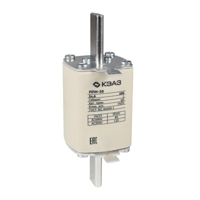 Предохранитель ножевого типа на номинальный ток 250 А, габаритом 1 и потерями мощности 23 Вт.