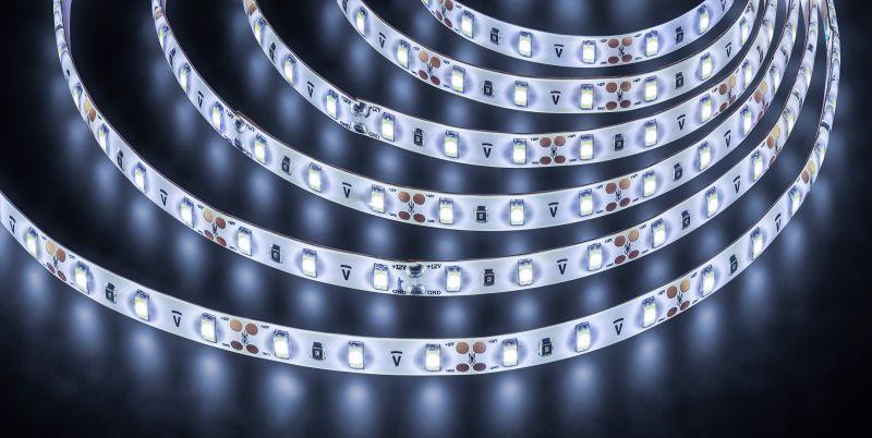 Представляет собой полосу длиной 5 м, со светодиодами в количестве 30 шт./1 м, с длиной секции 50 мм. Самоклеющаяся, без адаптера подключения. Дает белый свет. Цветовая температура 6000 К.