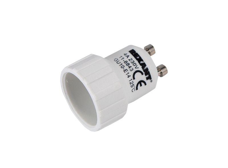 Цокольный переходник GU10 – Е14 предназначен для подключения ламп с цоколем Е14 к патронам GU10. Распространен в быту и строительстве, когда нужно заменить один тип цоколя лампы на другой.