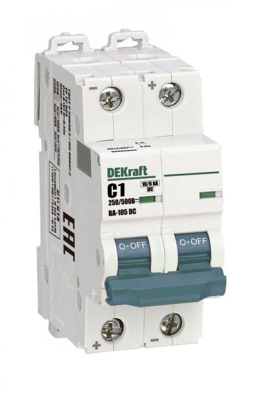 Автоматический выключатель серии ВА-105 DC Dekraft; 2P; ном. ток 1 А; характеристика C; откл. способность Icn = 10 кА при 250 В/6 кА при 500 В; установка – на DIN-рейку; ширина – 1 мод. х 18 мм. Выключатели ВА-105 DC применяются для защиты от перегрузки и КЗ в цепях постоянного тока, в частности в системах автоматизации и управления, транспорта, генерации и распределения электроэнергии и др. Окошко-индикатор всегда показывает состояние аппарата вне зависимости от положения рукоятки управления.