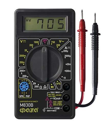 3,5 цифр.мультиметр. Измерение пост.и перем.напр-я, пост.тока, сопротивления. Диод тест. Проверка транзисторов. Защита от перегрузки. Индикация полярности, разряда бат. CAT II 600В, CAT I 1000В. Комплект — бат.9В, щупы. Коробка с подвесом.