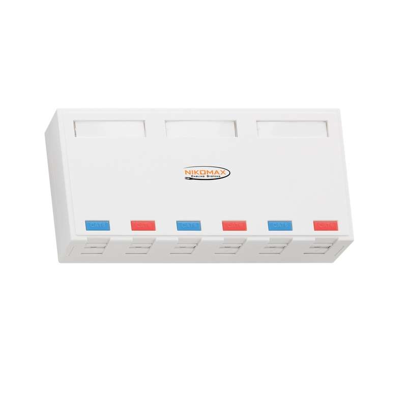 Коммутационные розетки являются составной частью горизонтальных подсистем СКС и предназначены для подключения оконечного оборудования на рабочих местах. Конструктивно розетки могут быть выполнены в двух вариантах: в виде законченного решения с впаянными в печатную плату портами RJ45 и IDC разъемами и в виде пластикового корпуса, в который отдельно устанавливаются коммутационные модули-вставки формата Keystone. Преимущество простых, пустых корпусов состоит в том, что туда могут быть установлены не только модули RJ45, но и любые другие, совместимые с форматом Keystone, в т.ч. телефонные, оптические и коаксиальные, в любой требуемой конфигурации. Корпуса розеток для настенного монтажа NIKOMAX – простое и удобное решение для монтажа сетей. NMC-MB6P-ST-WT — модели 6 портов. Каждый порт данных розеток снабжен индивидуальной шторкой, защищающей контакты от оседания пыли. На корпусах предусмотрены дополнительные выламывающиеся окошки, позволяющие подвести кабели с любой стороны. Для удобства администрирования на всех крышках имеются площадки для маркировки и для установки цветных иконок.