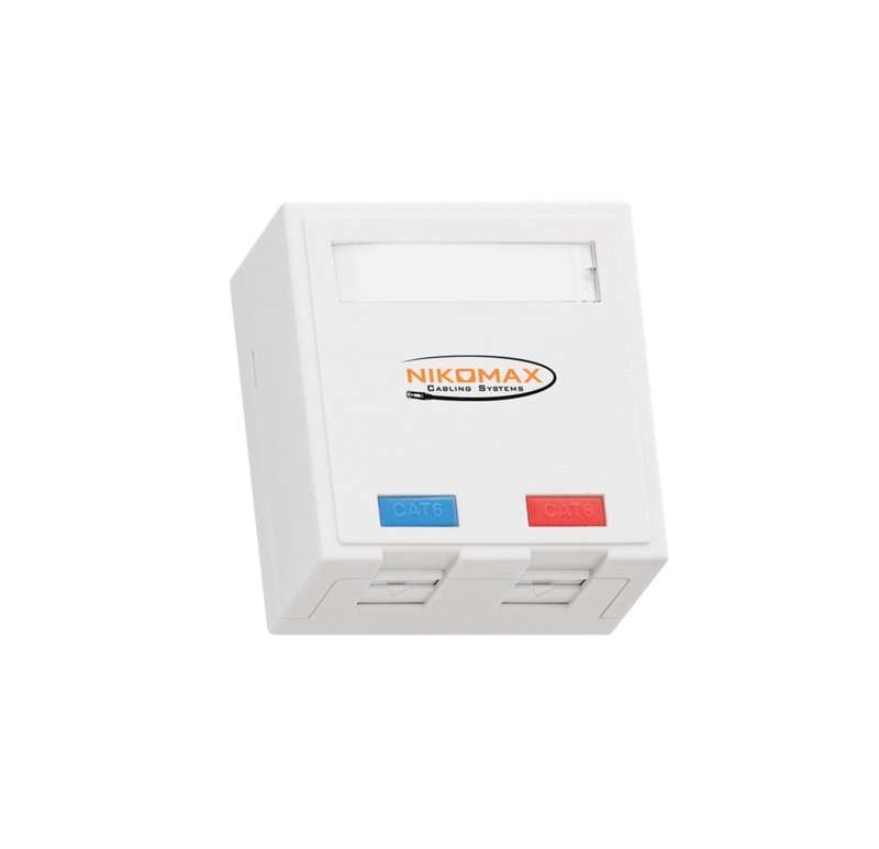 Коммутационные розетки являются составной частью горизонтальных подсистем СКС и предназначены для подключения оконечного оборудования на рабочих местах. Конструктивно розетки могут быть выполнены в двух вариантах: в виде законченного решения с впаянными в печатную плату портами RJ45 и IDC-разъемами и в виде пластикового корпуса, в который отдельно устанавливаются коммутационные модули-вставки формата Keystone. Преимущество простых пустых корпусов состоит в том, что туда могут быть установлены не только модули RJ45, но и любые другие, совместимые с форматом Keystone, в т.ч. телефонные, оптические и коаксиальные в любой требуемой конфигурации. Корпуса розеток для настенного монтажа NIKOMAX – простое и удобное решение для монтажа сетей. NMC-MB2P-ST-WT — модели на 2 порта. Каждый порт данных розеток снабжен индивидуальной шторкой, защищающей контакты от оседания пыли. На корпусах предусмотрены дополнительные выламывающиеся окошки, позволяющие подвести кабели с любой стороны. Для удобства администрирования на всех крышках имеются площадки для маркировки и для установки цветных иконок.