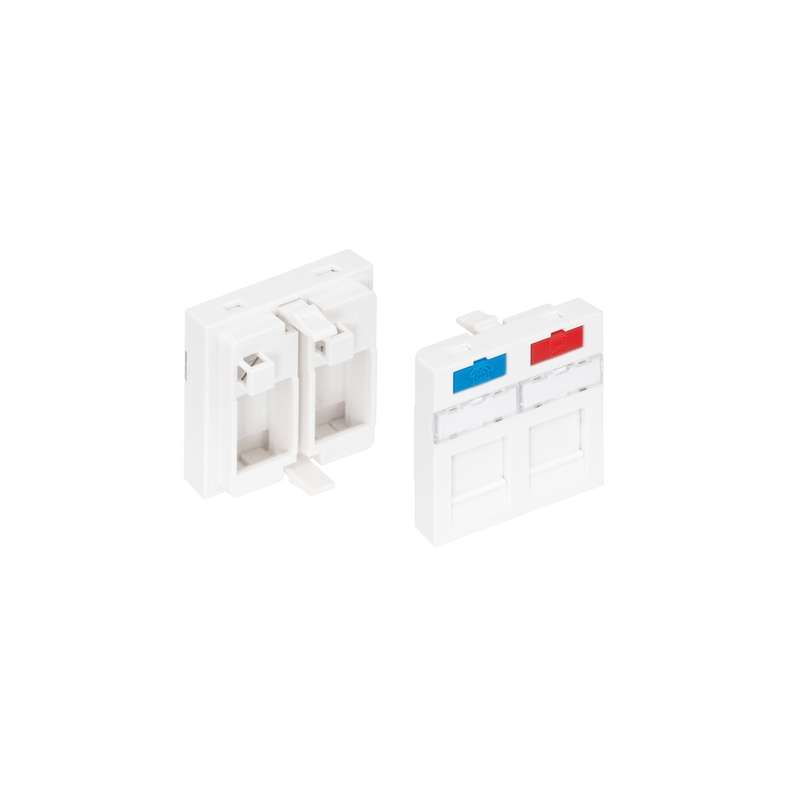 Для организации информационных портов на рабочем месте при помощи коробов, колонн и внутренних розеток применяется широкий спектр вставок французского стандарта Mosaic 22,5х45 мм и 45х45 мм. Вставки фиксируются в лицевых панелях при помощи удобных защелок и при необходимости легко демонтируются. В NMC-PM2P-PF-WT устанавливаются 2 модуля Keystone любого типа. Вставки снабжены шторкой для защиты гнезда от попадания пыли при отключенном коммутационном шнуре. В комплекте со вставками идет набор цветных иконок. Кроме этого имеются дополнительные площадки для маркировки, закрытые съемными прозрачными крышками.