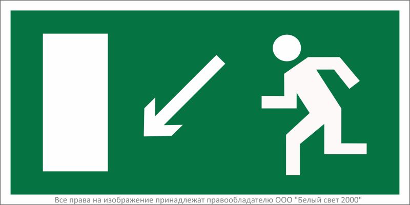 Знак безопасности «Направление к эвакуационному выходу налево вниз» габаритные размеры 200х100 мм, фактические размеры 200х100 мм, сигнальный цвет — зеленый, контрастный цвет — белый