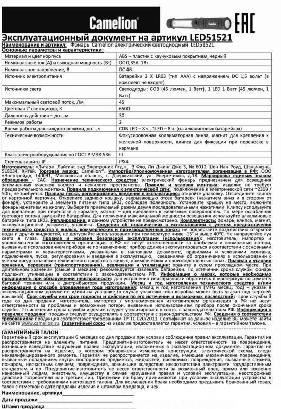 Фонарь Camelion электрический светодиодный комбинированный (дальний + ближний свет) — для мелких работ в затемненных условиях. Цвет корпуса: матовый черный с каучуковым напылением. Работает от батареек 3 X ААA (не входят в комплект). Материал корпуса — пластик. Источники света — 1 точечный светодиод мощностью 1 Ватт со световым потоком 45 люмен (для дальнего света) с фокусировкой коллиматорной линзой; COB — светодиод (технология Chip — on — Board, светится не одна точка, а вся желтая поверхность) для ближнего света мощностью 1 ватт со световым потоком 45 люмен — в боковом плафоне. Дистанция освещения: дальний свет — до 30 м., ближний — до 7 м. Два режима работы. Выключатель — кнопочного типа (с защитной резиновой накладкой) на корпусе фонаря. Время работы — до 8 часов в обоих режимах (на алкалиновых батарейках). Комплектация: фонарь, магнит для крепления к металлу, клипса для крепления на клапан кармана или поясной ремень, упаковка. Степень пыле-влаго-защиты IPX4. Упаковка: открывающийся двойной блистер. Максимальный линейный размер фонаря 15,5 см. Размер упаковки 3,3 см x 11,5 см x 23,3 см. Вес без упаковки 0,085 кг. Вес с упаковкой 0,116 кг.
