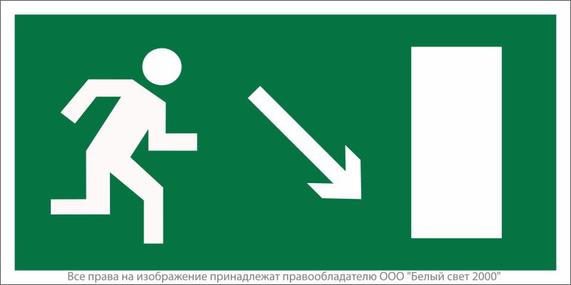 Знак безопасности «Направление к эвакуационному выходу направо вниз» габаритные размеры 350х175 мм, фактические размеры 350х175 мм, сигнальный цвет — зеленый, контрастный цвет — белый