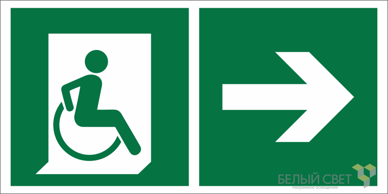 Знак безопасности «Направление движения к эвакуационному выходу МГН направо» габаритные размеры 200х100 мм, фактические размеры 200х100 мм, сигнальный цвет — зеленый, контрастный цвет — белый