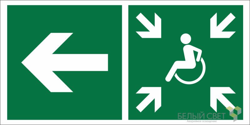 Знак безопасности «Направление движения к пункту сбора (безопасной зоне) МГН налево», габаритные размеры 300х150 мм, фактические размеры 300х150 мм, сигнальный цвет — зеленый, контрастный цвет — белый