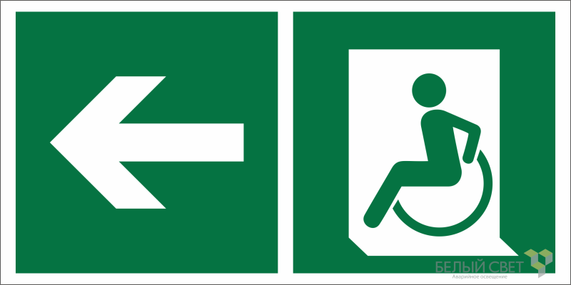 Знак безопасности «Направление движения к эвакуационному выходу МГН налево», габаритные размеры 300х150 мм, фактические размеры 300х150 мм, сигнальный цвет — зеленый, контрастный цвет — белый